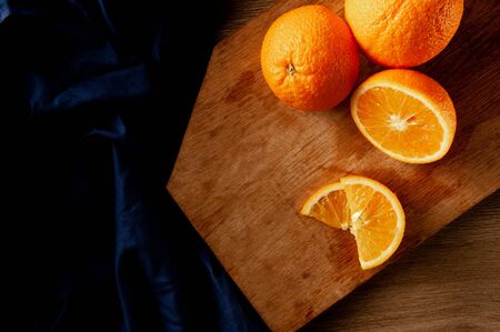 Slices of fresh orange on a wooden cutting board. Selective focus.