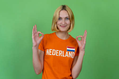 Portrait of happy young Dutch Sports fan wearing inflatable hand cheering, standing in front of the flag of the Netherlands
