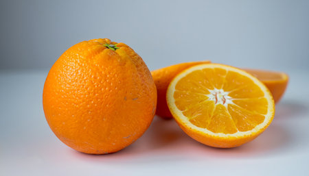Fresh orange fruit placed on minimalistic light background, showcasing vibrant color and texture. Healthy eating and nutrition concept.