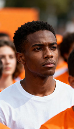 Focused young man in white t shirt standing among a crowd dressed in orange during an outdoor daytime event or gathering.