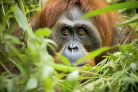 a sharp-focus photo of a sumatran orangutan amid jungle foliage, created with generative ai