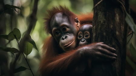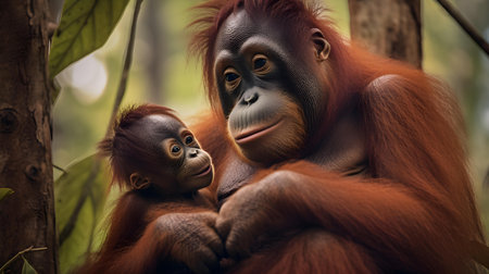 A tender moment unfolds in the heart of the rainforest A mother orangutan cradles her baby, their fur shimmering in soft sunlight that filters through the lush canopy Verdant leaves frame the pair, creating a serene haven in the vibrant jungle AI Generative