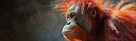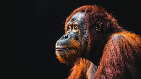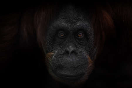 clever look of a red-haired orangutan, on a black background a portrait of a full face of a clever anthropoid.