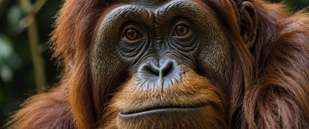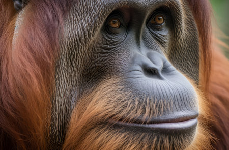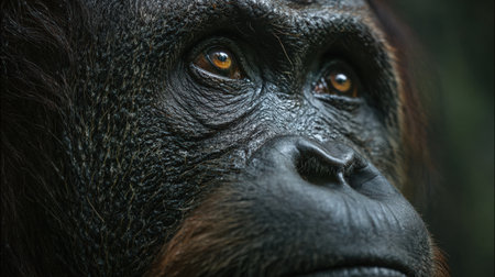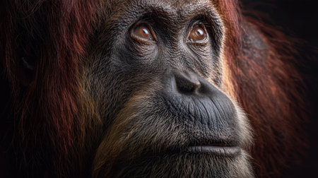 An intense, detailed close-up captures the wisdom and gentle gaze of an orangutan. The rich textures of its fur and skin highlight its primate characteristics and deep connection.