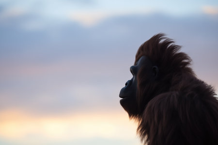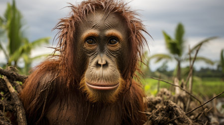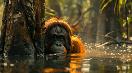 In the verdant embrace of Sumatra's rainforest, an endangered Bornean orangutan clings to a tree, its soulful eyes reflecting centuries of resilience. Its shaggy coat, a testament to its arboreal existence, blends seamlessly with the lush foliage. As the sun filters through the canopy, casting ethereal shadows upon the ancient forest, the orangutan surveys its dwindling habitat with a profound gaze, a silent plea for conservation amidst the encroaching threats of deforestation and habitat loss.