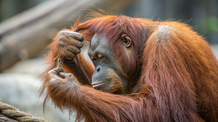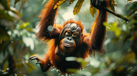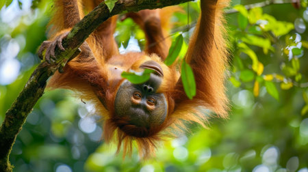 This orangutan, an arboreal great ape, calls the rainforests of Indonesia and Malaysia home. With its distinctive reddish-orange fur, this critically endangered species is known for its intelligence and tree-dwelling lifestyle. Capture the essence of nature's wonders with this stunning image of an orangutan in its natural habitat.