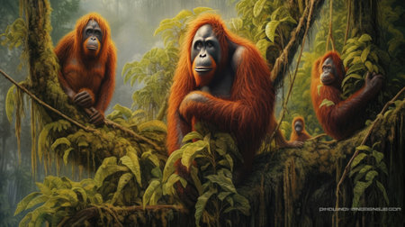 An AI generated illustration of an orangutan perched atop a lush green tree in a tropical jungle