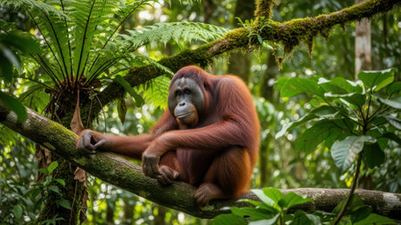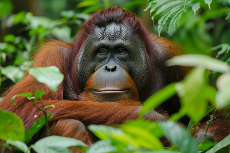 A serene orangutan sits quietly in a vibrant rainforest, surrounded by lush green leaves, showcasing its peaceful demeanor and natural habitat in the wild.