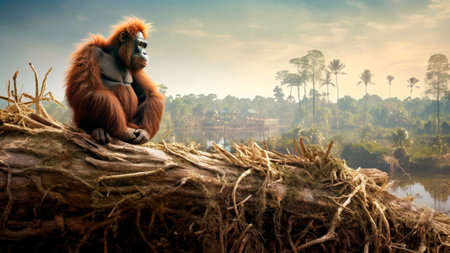Amidst the desolation caused by deforestation, a melancholic orangutan finds respite on a felled tree, its presence a poignant symbol of the urgent need to protect our forests. Generative AI
