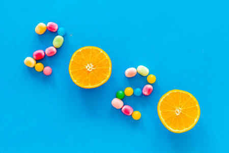 Sweet New Year design. 2020 laid out with candy and oranges on blue background top view copy space