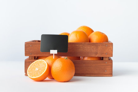 Oranges with a price holder in a wooden box on a white table