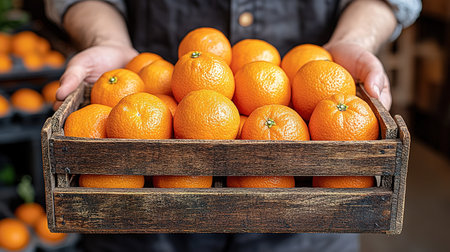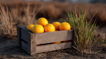 A charming wooden crate filled with fresh oranges showcases nature's bounty in a rural landscape. Dried grass surrounds the vibrant fruit.
