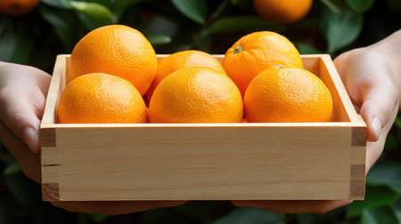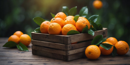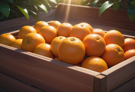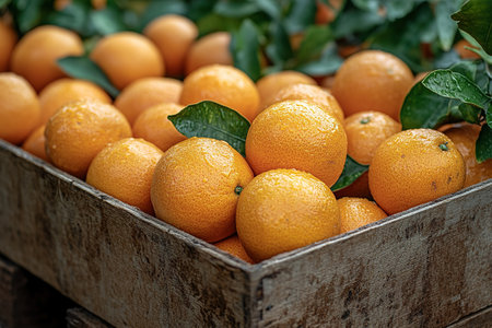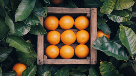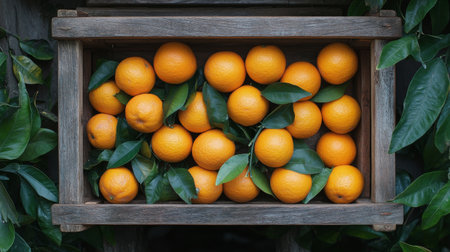 A wooden crate filled with vibrant oranges rests amidst lush green leaves, showing the freshness of the harvest, inviting a sense of natural abundance.