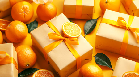 Title: showing title: bright orange tangerines with green leaves arranged around two cardboard gift boxes. resolution use.