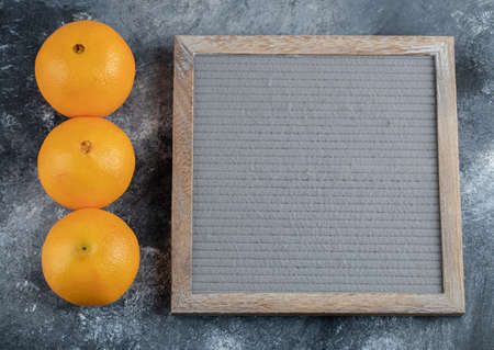 Three tasty oranges and frame on marble background