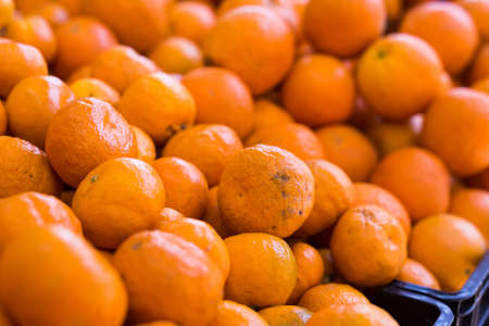 apetitic juicy farm mandarins at market counter