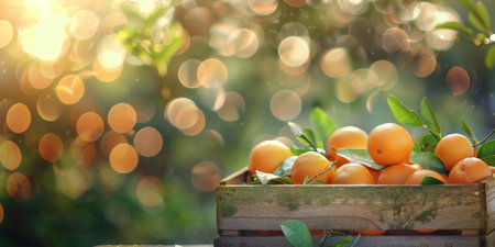 Tangerines harvested in a wooden box with orchard and sunshine in the background. Natural organic fruit abundance. Agriculture, healthy and natural food concept. Horizontal composition.