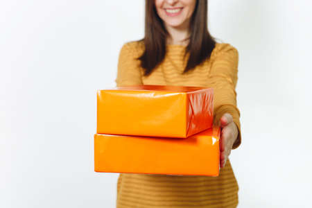 Close up caucasian fun young happy woman in yellow clothes, on birthday party holding orange gift boxes with present, celebrating and enjoying holiday on white background isolated for advertisement