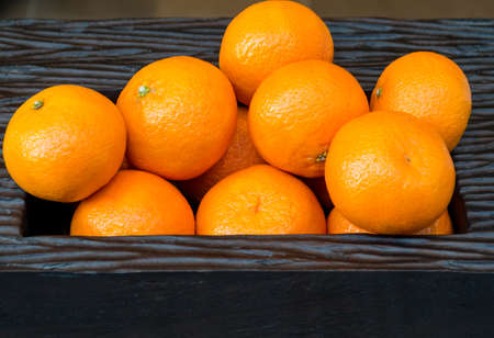 Ripe tangerines in a wooden box on a wooden table