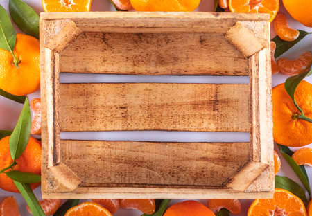 Top view empty wooden box surrounded with mandarins