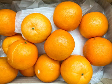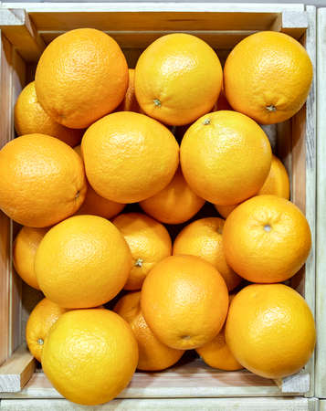 wooden crate with oranges top view. concept market, gastronomy.