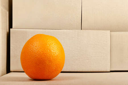 Photo of orange fruit standing on stacked cardboard boxes background.