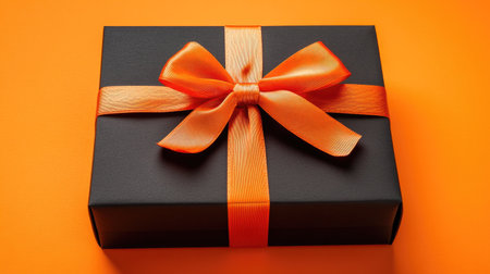 A stylish black gift box adorned with an orange ribbon, perfect for various occasions. This image features vibrant colors and elegant design, ideal for packaging ideas.