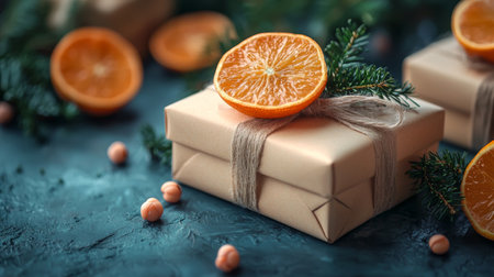 A beautifully wrapped gift box adorned with dried orange slices and greenery, set against a festive backdrop.