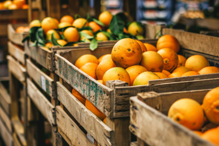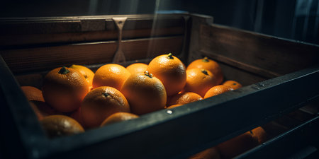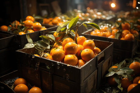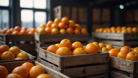 AI Generated. Fresh ripe organic oranges in wooden crates at warehouse with blurred background and space for text