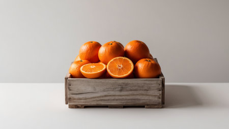 AI Generated. Fresh oranges in a rustic wooden crate with one orange cut in half