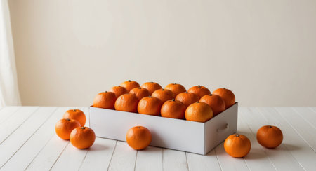 AI Generated. A box with fresh tangerines on on a white wooden table with copy space