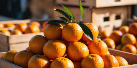 Oranges harvested in wooden boxes in a warehouse. Natural organic fruit abundance. Healthy and natural food storing and shipping concept.
