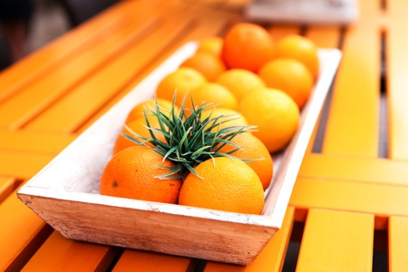 fresh colorful orange fruits decorative on table in summer outdoor