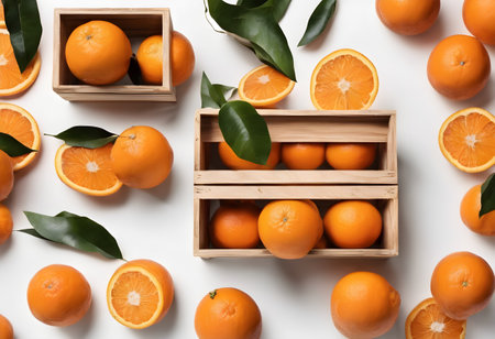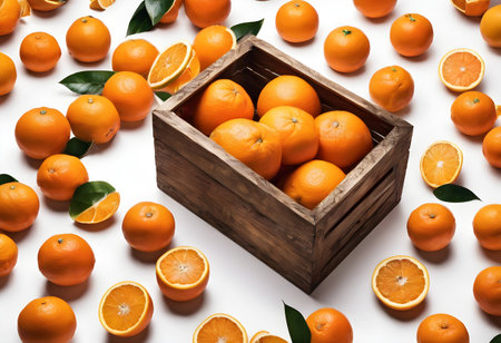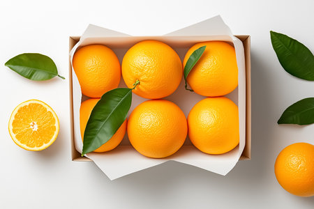 Crate of ripe oranges with leaves, top view on white. freshness and natural, perfect for food themes. A.I.