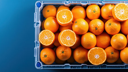 A crate full of oranges with some of them cut open. The oranges are fresh and ripe, and the crate is white