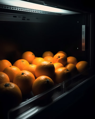 Oranges in an open refrigerator. Shallow depth of field.