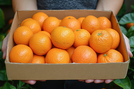 AI Generated. Fresh Oranges in a Cardboard Box Surrounded by Green Leaves
