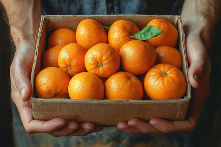 farmer holding a box of oranges in his hands.