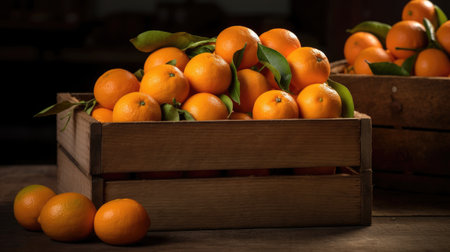 AI Generated. Fresh Tangerines in a Rustic Wooden Box on Black Background