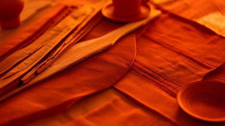 Orange burlap tablecloth with a coarse woven texture and rustic elegance in a cozy setting