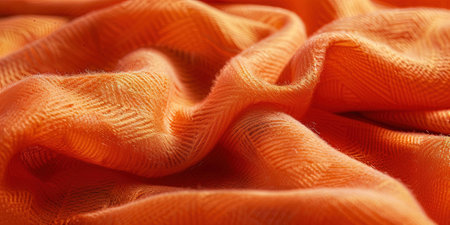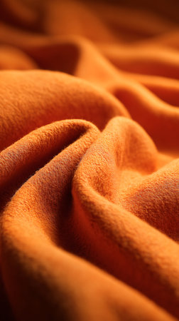 Macro shot displaying soft folds and intricate textures of orange fleece fabric. Close-up highlights the cozy, warm tone and detailed surface structure of material.