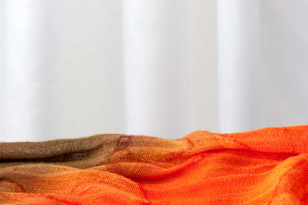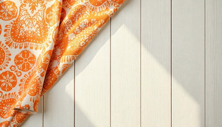 Orange patterned fabric on a white wooden table surface