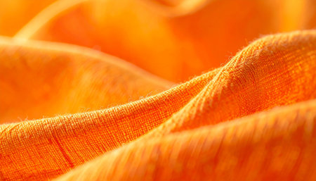 A close-up view showcasing the intricate details of textured fabric with vibrant orange hues and visible stitching, perfect for design inspiration.