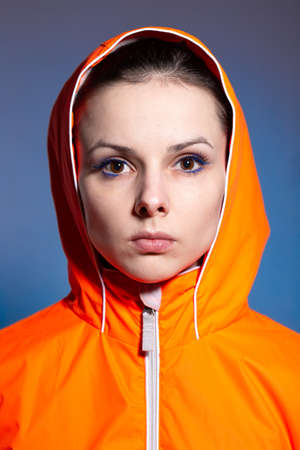 girl with bright puffy jacket posing stock photo, dark turquoise and light orange