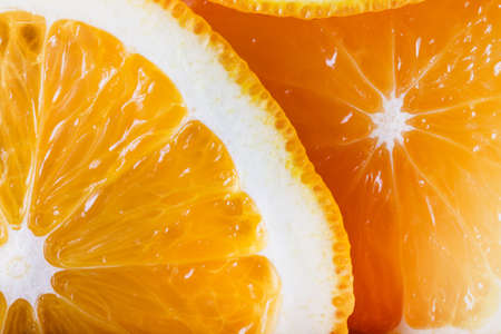 Macro food background of fresh translucent juicy sliced oranges for high resolution banners