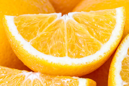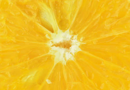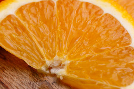 Close up of sliced ripe orange, macro. Yellow fresh orange surface background or texture. Top view