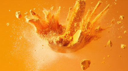 This striking image showcases a dynamic explosion of yellow powder against a vibrant orange backdrop, ideal for creative and artistic concepts.