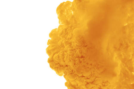 Color Liquid in dynamic flow forming interesting and unique shapes and bubbles. Colorful yellow ink mixing in an unique pattern. Artistic design. Isolated on white background.