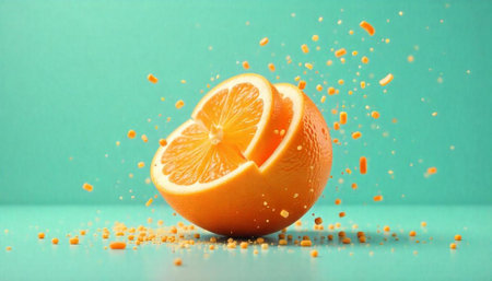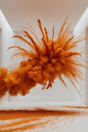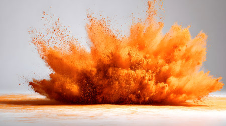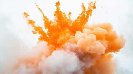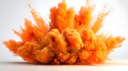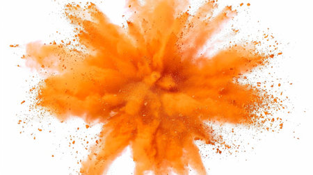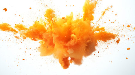 Burst of vibrant orange powder against a white background, capturing energetic explosion and vivid motion. Abstract art and color dynamics concept.