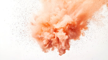 An explosive cloud of orange dust erupts against a white background, creating a dynamic and striking visual effect, perfect for various artistic and graphic applications.